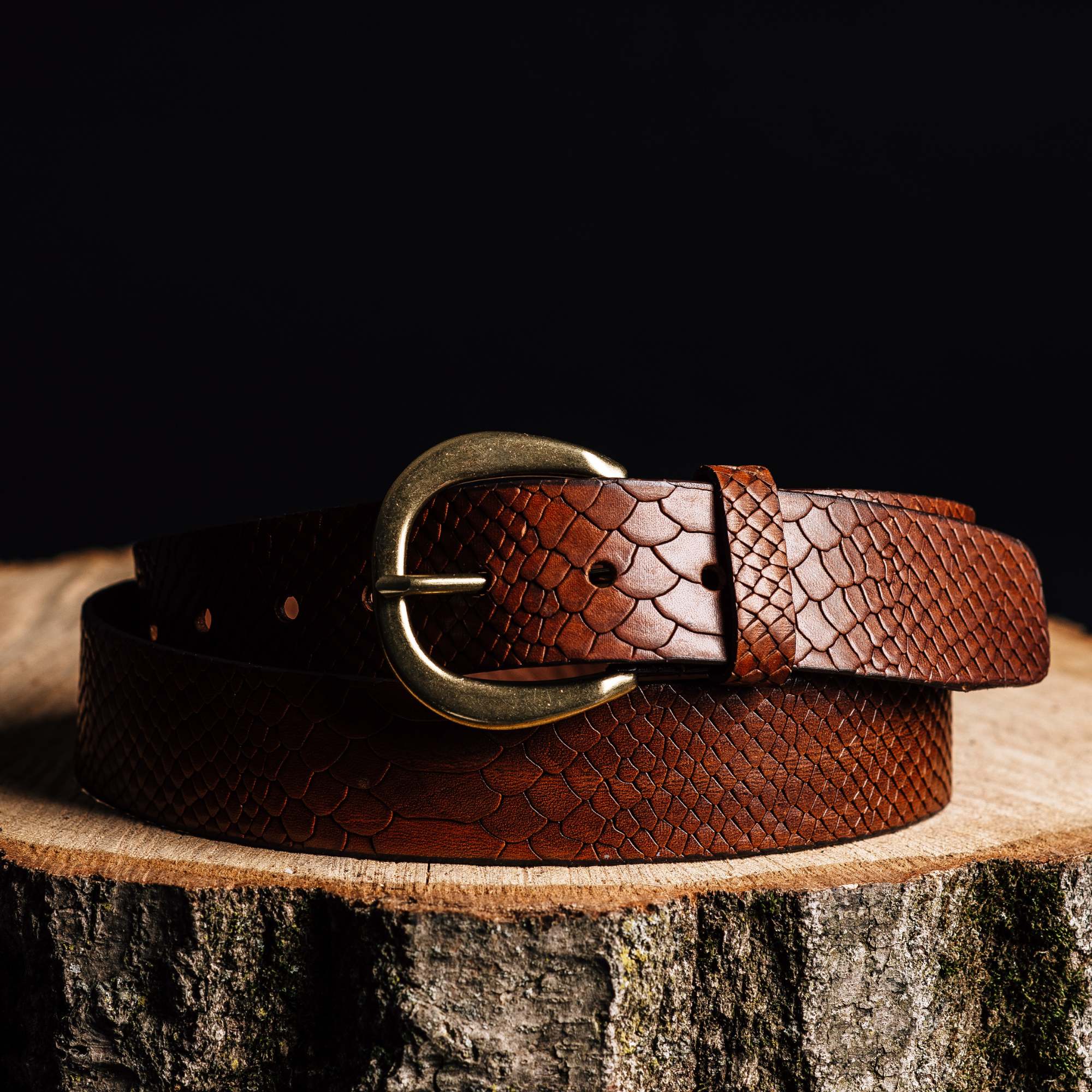 Crafted from smooth leather, this snake skin embossed patterned belt is made for those who can appreciate an exotic look. Paired with an elegant gold buckle and matching hoop, this belt is downright dashing.