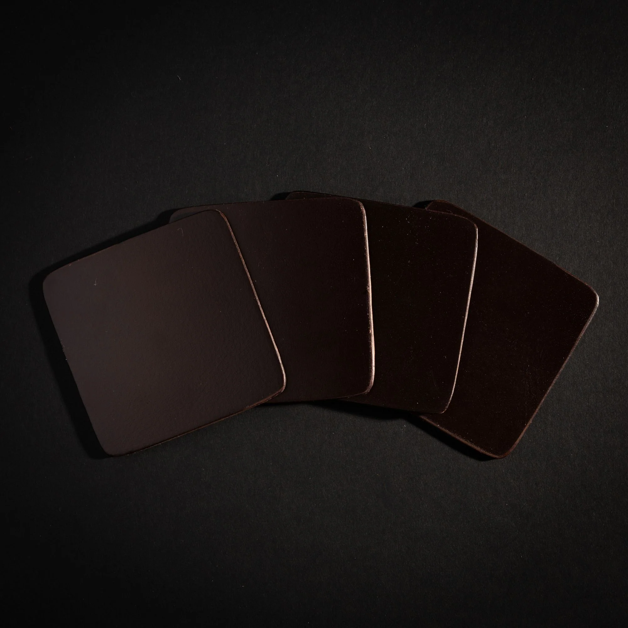 Cut out from one solid piece of leather! No bonded leather, no imitation leather, these coaster sets will soften and age beautifully. Great gifts for Birthdays, Father's Day, Weddings, Anniversaries, or Home Bars.